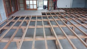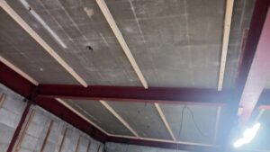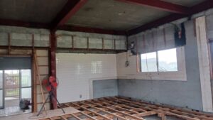 木造のように柱に直接下地を留められないので、まずはコンクリートに木を固定するところから丁寧に施工しています。