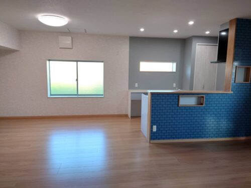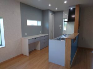 御夫婦で見に行かれて気に入られたグレーの扉のキッチンは、流行りのくすみカラーの水色壁紙とアンティーク調の収納扉とものすごくマッチしています。