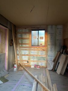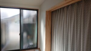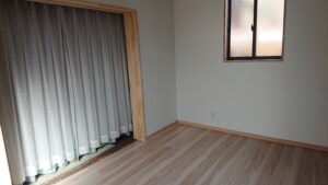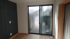 コンクリートの基礎工事から柱の加工も全て社員で行いました。自社倉庫で大工さんがオス、メスの加工から一つ一つ丁寧に手仕事で仕上げた洋室。